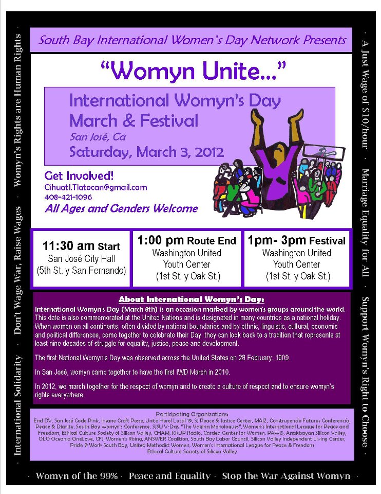 Founding Organizations: Cihuatl Tlatocan-MAIZ, FOCUS-SV, Silicon Valley DEBUG, San Jose Peace and Justice Center, San Jose Code Pink, SJSU WOWI (Womyn on Womyn’s Issues), Women’s International League for Peace and Freedom, LGBTQ Youth Space, and SOMOS Mayfair. Continuing endorsers from last year are: La Red Xicana/Indigena, Services, Immigrant Rights and Education Network (SIREN), SJSU Womyn’s Studies Department, Voluntarios de la Comunidad (confirmed), Cardea Center for Women, SJSU Women’s Studies. New Endorses are: Californians for Justice, San Jose Raging Grannies, 9to5 Bay Area Chapter, National Association of Working Women, San Jose Food Not Bombs, Unite HERE Local 19, and UFCW Local 5 SEIU Local 521 Latino Caucus, and Planned Parenthood Mar Monte.