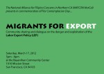 Though many U.S. immigrant rights activists attribute exploitation, abuse, discrimination, deportation and family separation suffered by immigrants to bad employers and problematic U.S. labor and immigration policies, this educational discussion tries to link U.S. Filipinos’ struggles to the LEP. This event will also give an opportunity to share and hear stories on how US Filipinos experienced/experiencing the impacts of LEP and how we as a community can take actions in addressing the root causes of LEP.