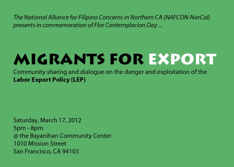 On the anniversary of Contemplacion’s death this year, NAFCON (National Alliance of Filipino Concerns) NorCal member organizations will be discussing the Philippine government’s labor export program (LEP) that sent Contemplacion to Singapore and continues to send thousands of workers to hundreds of countries around the world. The organizations will share the work they are doing to address the problems that the LEP creates for Filipinos in the U.S. This includes blatant violations of migrant workers’ rights such as wage theft; race, language, and national origin discrimination; and even labor and human trafficking. These organizations have been waging successful campaigns to defend and advance the basic rights of migrant workers, right here in the San Francisco Bay Area.