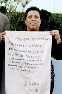 On March 8, Morena participated in an International Women’s Day protest outside her hotel. She talked to local politicians about abuses housekeepers suffer and described how she takes medication regularly for back and shoulder pain.