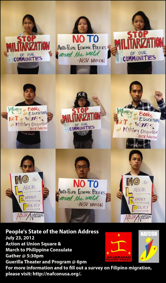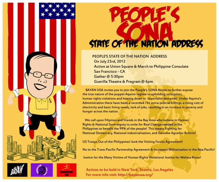 BAYAN USA invites you to join the People’s SONA Action to further expose the true nature of the puppet Aquino regime in upholding corruption, human rights violations and bowing down to imperialist demands! Under Aquino’s administration there have been a recorded 76+ extrajudicial killings, a rising cost of electricity and basic living needs and lack of jobs, resulting in an increase in poverty and hunger across the nation.