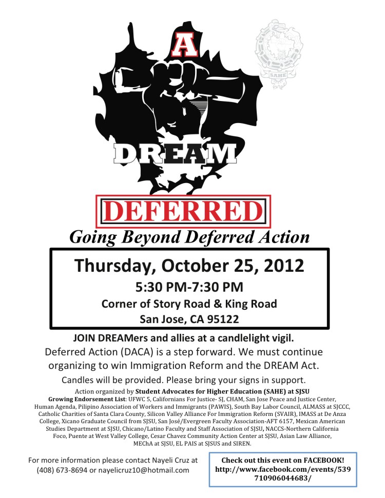 October 25. 530-730 PM @ Story & King in San Jose. Join ABSV, Student Advocates for Higher Education (SAHE) from SJSU, and other community organizations for a candlelight vigil in support of immigration reform.