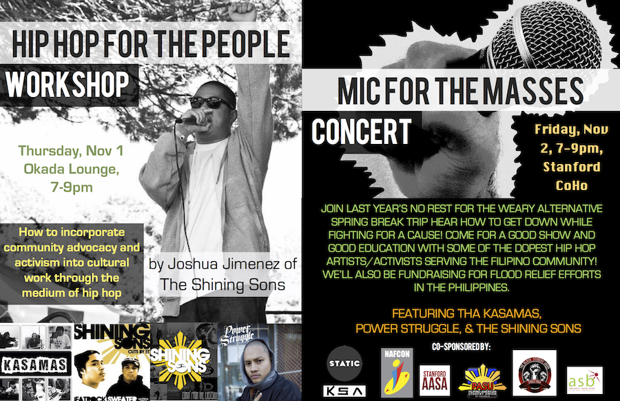 November 1-2 @ Stanford. Thursday is the Hiphop for the People Workshop. Friday is the Mic for the Masses concert with The Kasamas, Power Struggle, and The Shining Sons.