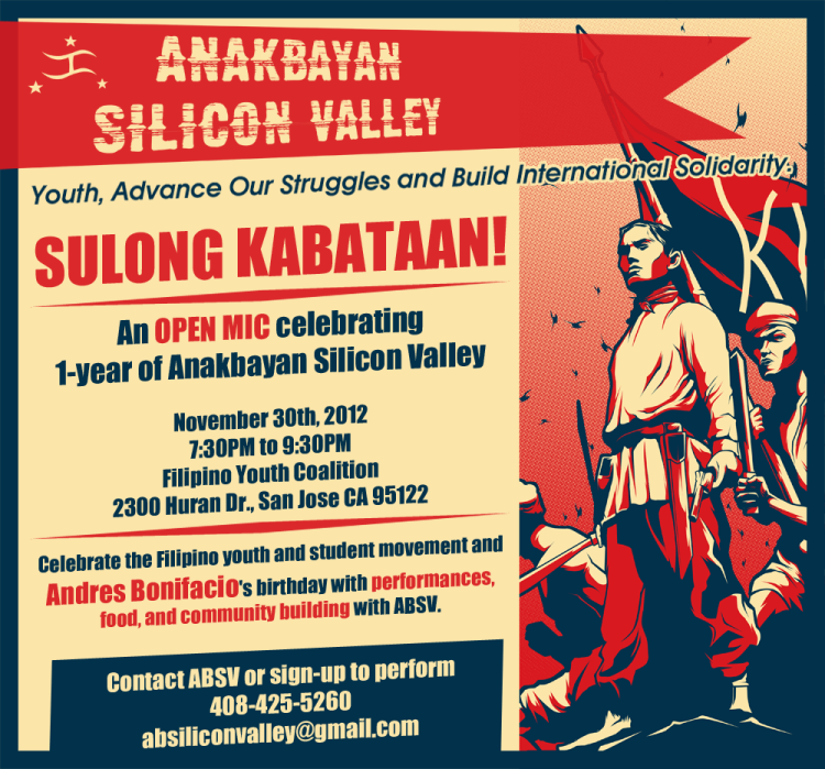 We will be celebrating the Filipino youth and student movement in the Philippines and around the world, as well as the birthday of Andres Bonifacio, a Filipino youth who led the Philippine revolution against Spain in 1896. We will also take a look back at ABSV’s community work since our founding on May 2011 and showcase our plans in the upcoming year as we continue to grow stronger in agitating, organizing, and mobilizing in the South Bay.