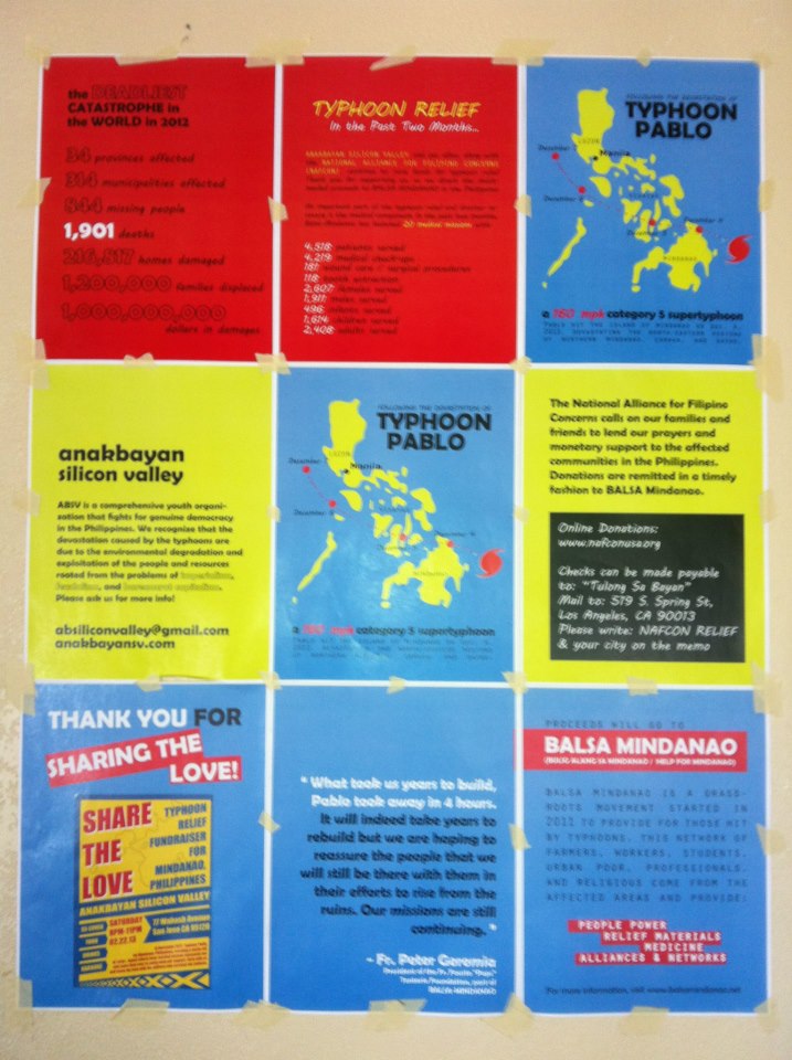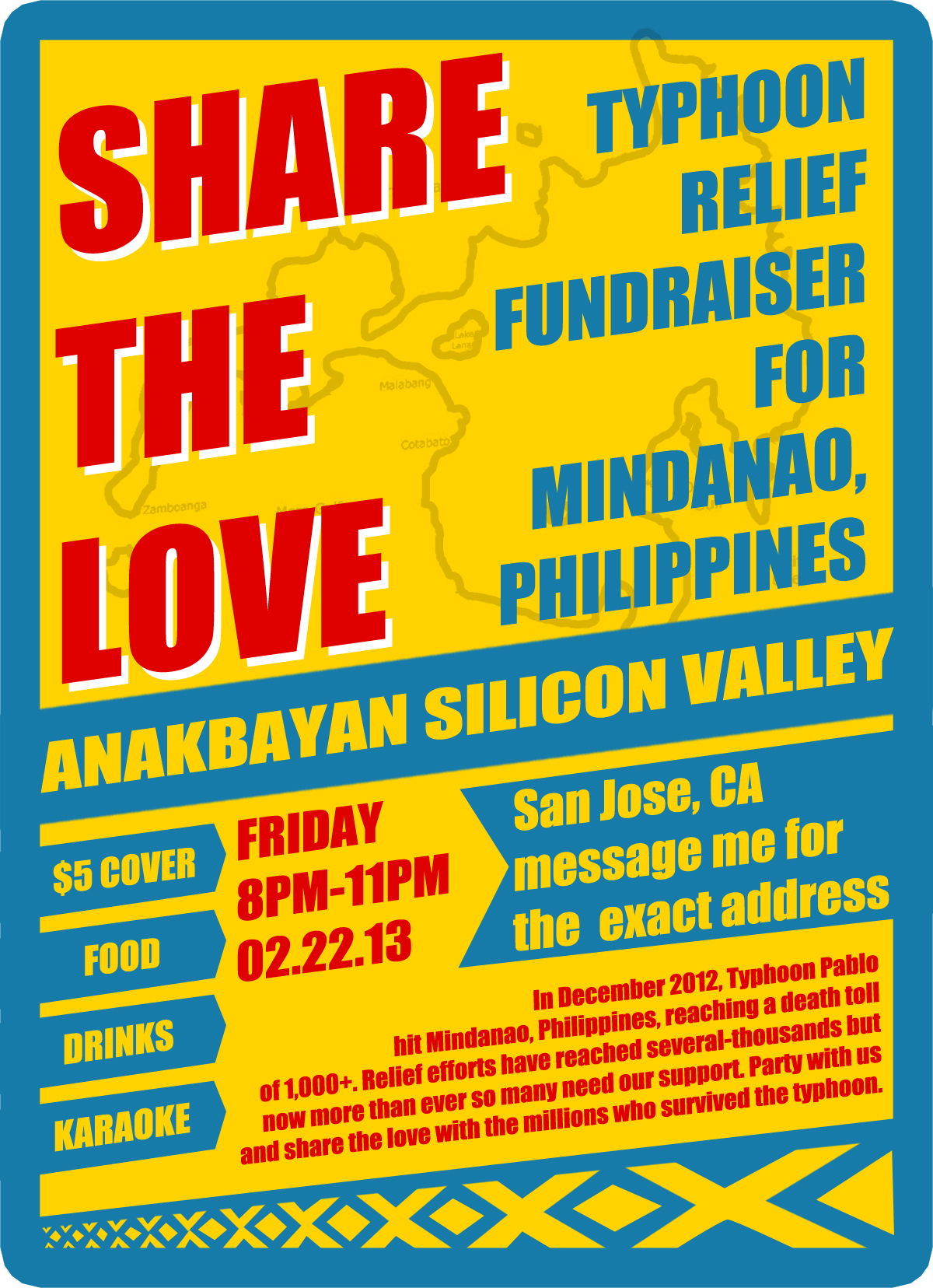 Share the Love: Fundraiser for Typhoon Pablo Relief Party Posted byanakbayansvFebruary 28, 2013March 20, 2013Posted inBlog House Party to raise funds for typhoon relief in the Philippines! Thank you for coming! Share this: Click to share on X (Opens in new window) X Click to share on Facebook (Opens in new window) Facebook Click to share on Tumblr (Opens in new window) Tumblr Like Loading... Related