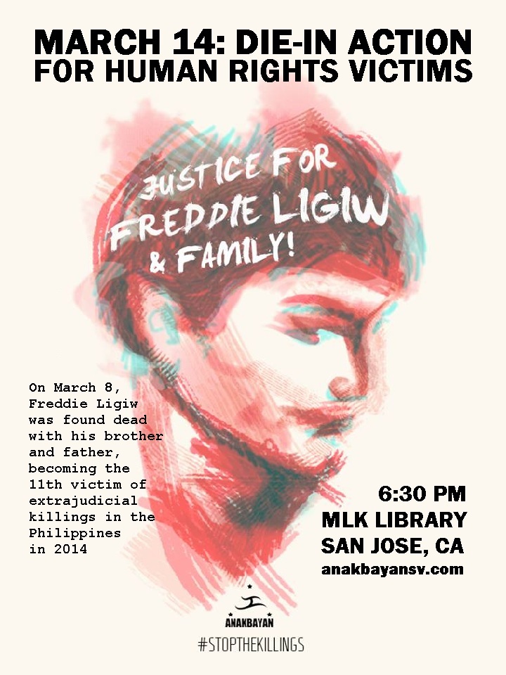 3/14 San Jose — Join us for a die-in action as we call for justice for Freddie Ligiw and his family and to call for an end to state-sponsored violence! We will have a short program and will have a die-in — where people lay on the ground holding placards while their bodies are outlined with chalk.