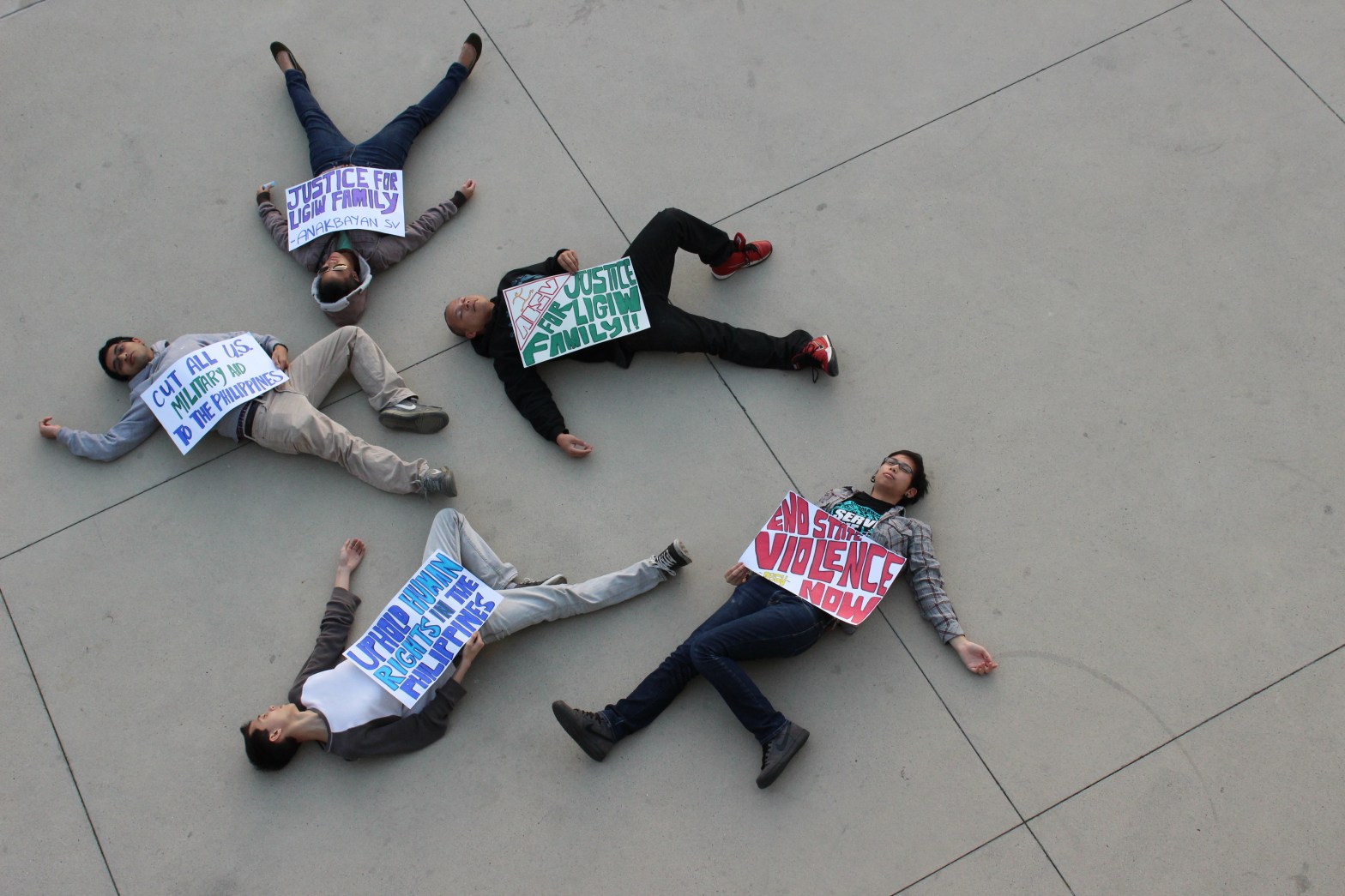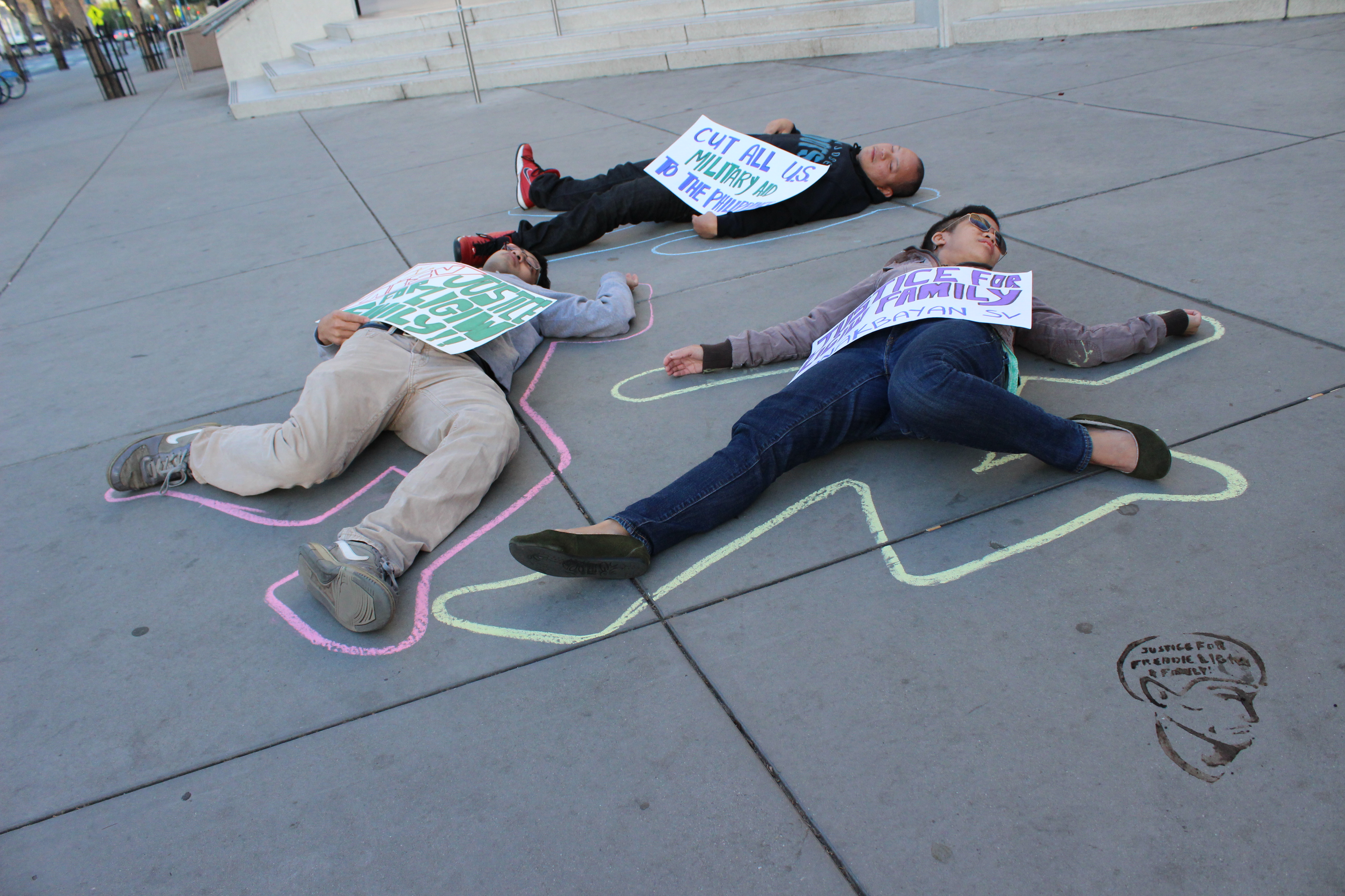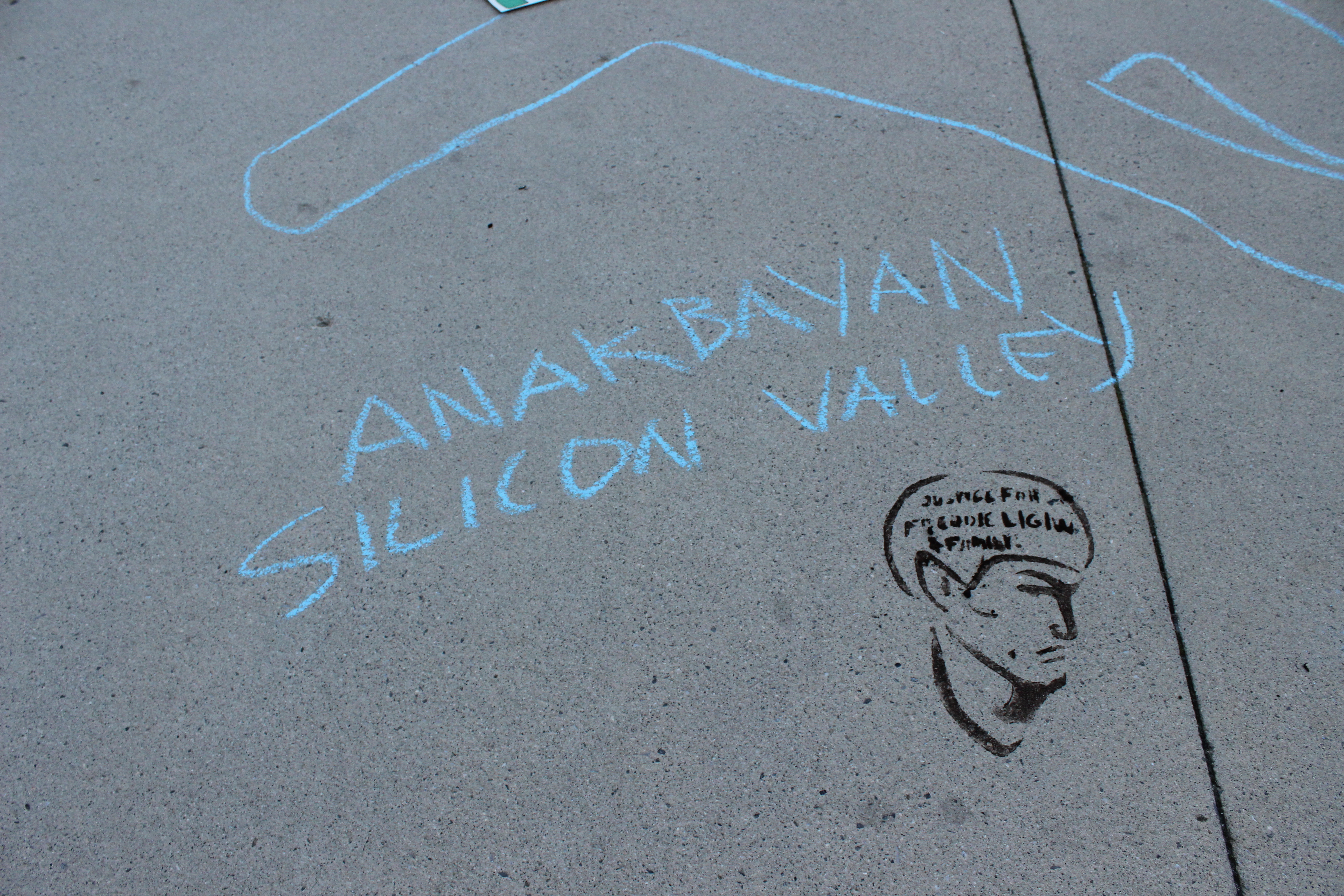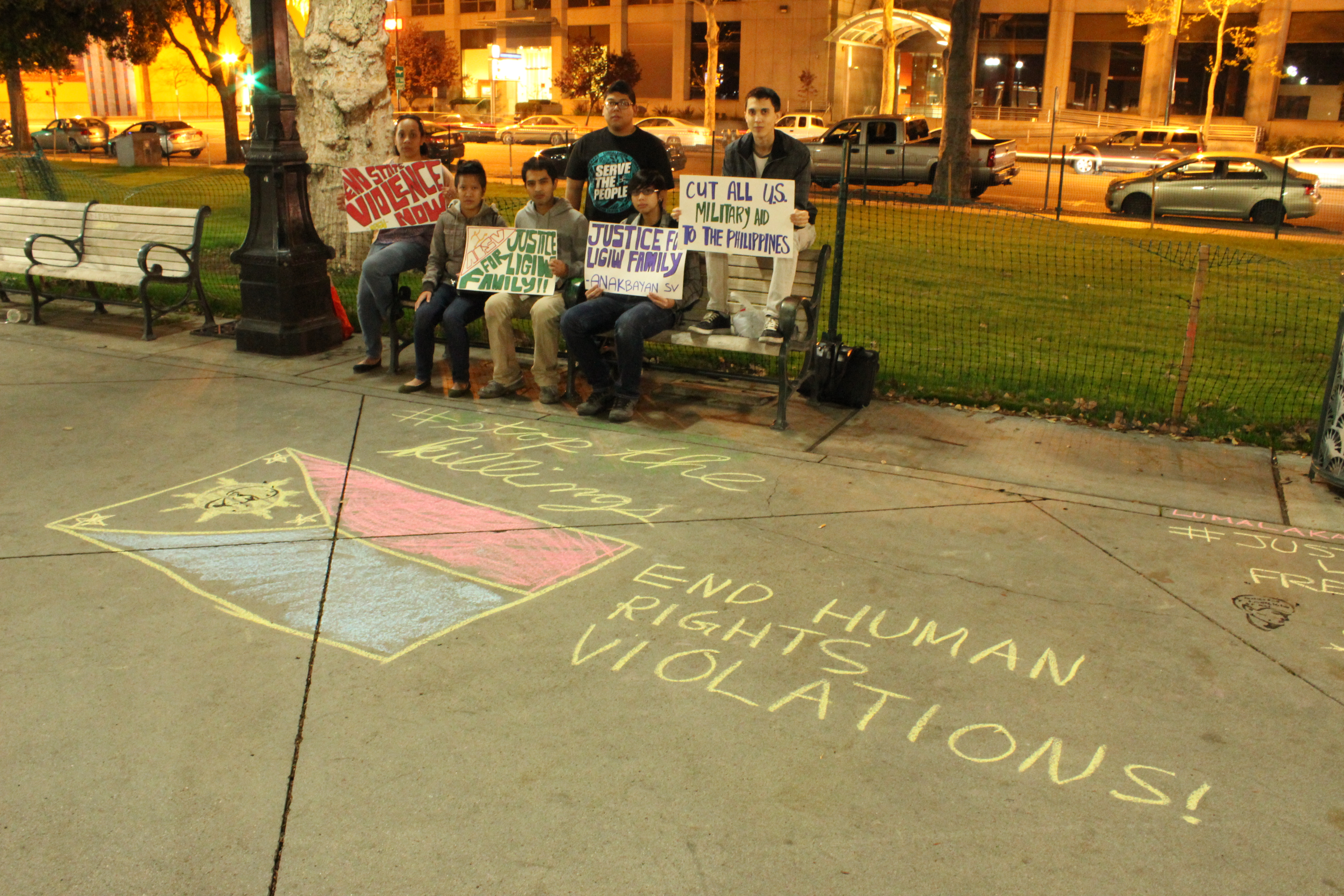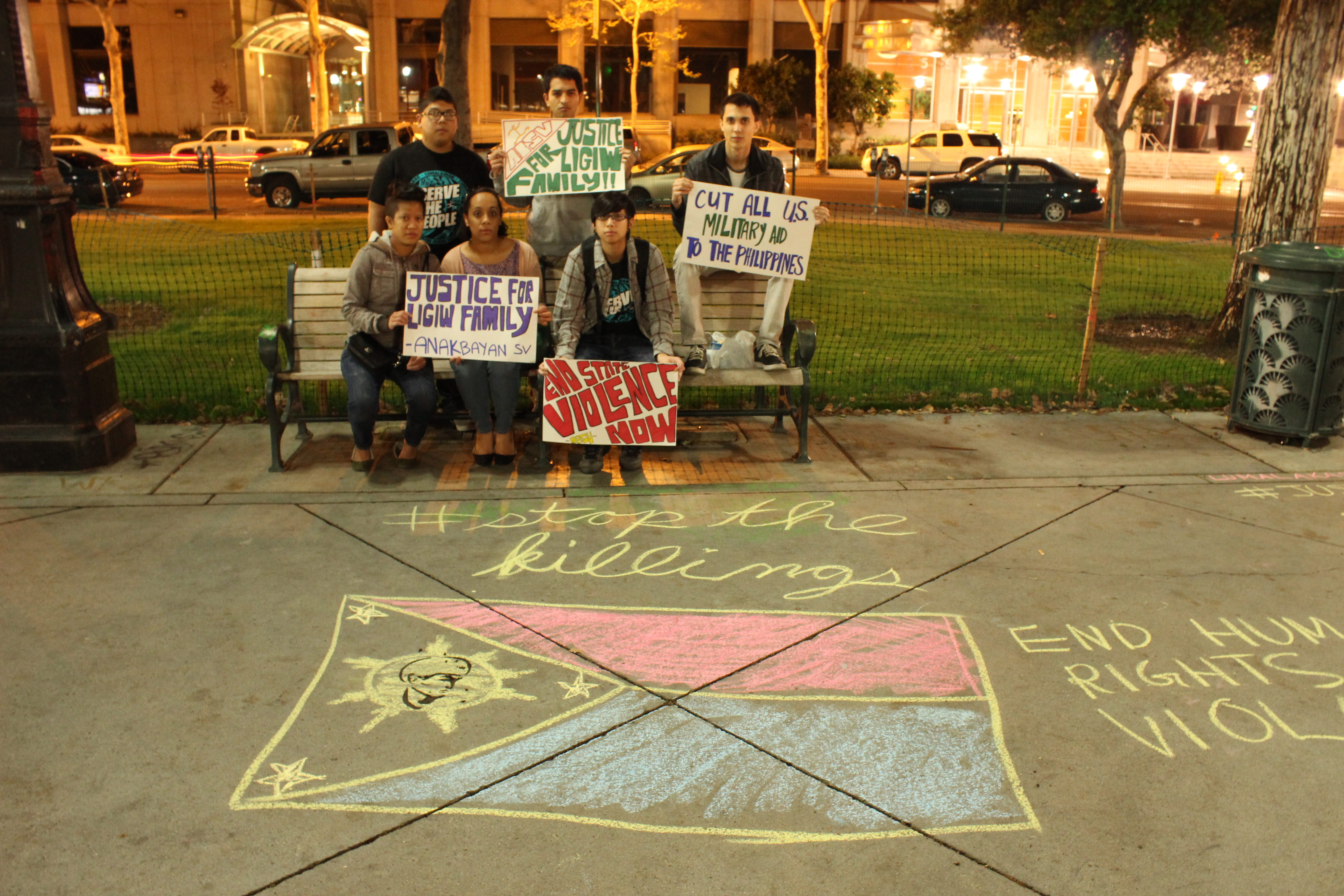 3/14/2014, San Jose, CA — Anakbayan Silicon Valley and PAWIS held a mobile “die-in” and mud stencil action demanding justice for Freddie Ligiw and his family. The action called for an end to state-sponsored violence in the Philippines. Members gathered starting at Martin Luther King Library on San Jose State University’s campus then marched to San Jose’s City Hall and ended the program at Cesar Chavez Memorial Park. ABSV’s statement was handed out to raise awareness in the local community. The program included members laying on the ground holding placards while their bodies are outlined with chalk to call attention to the ongoing extrajudicial killings occurring in the Philippines. At the end, members marched through downtown San Jose, chanting and concluding by reading a statement to demand Justice for Freddie Ligiw and his family, and to stop US aid to to the Philippine government. The pictures are shown below.