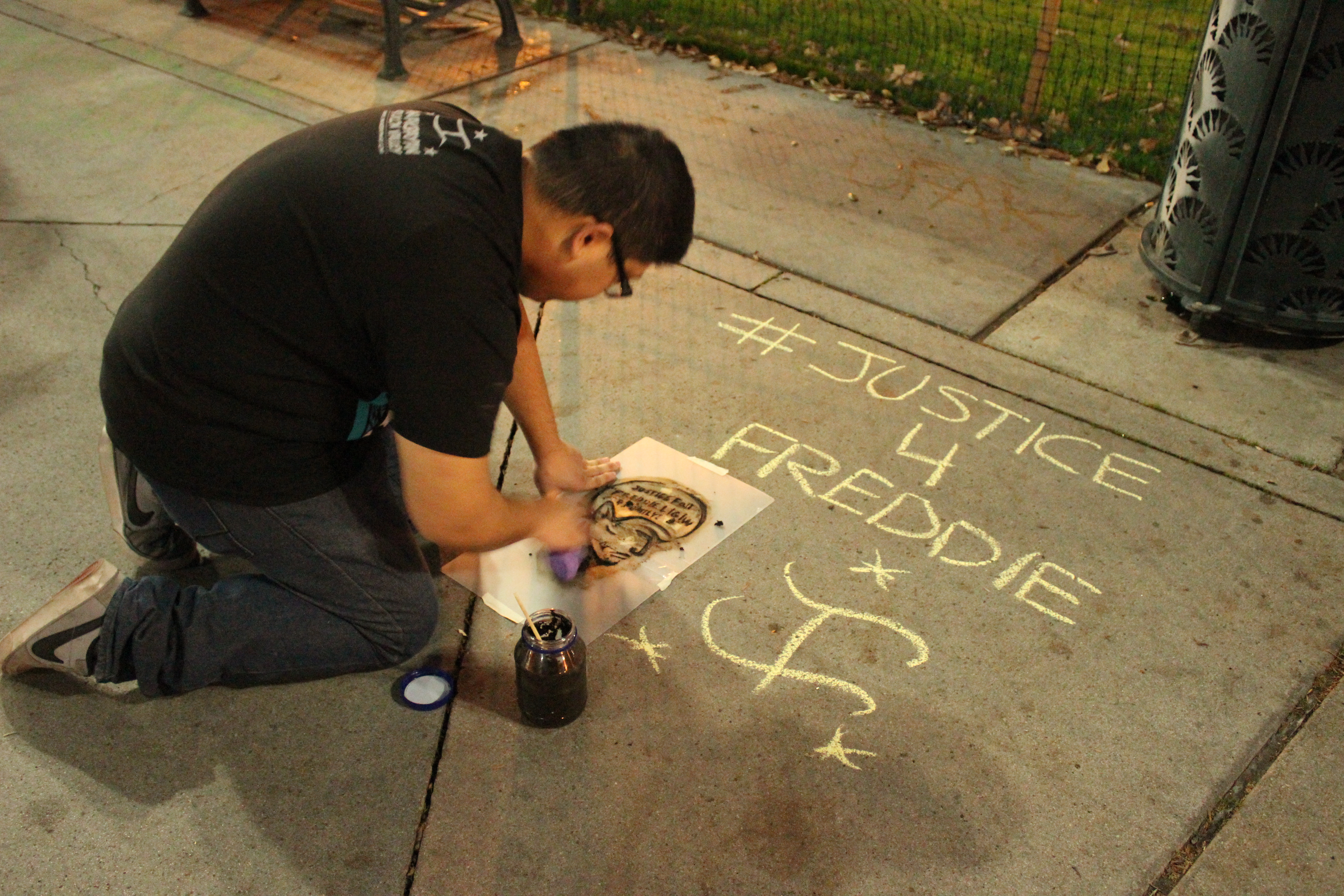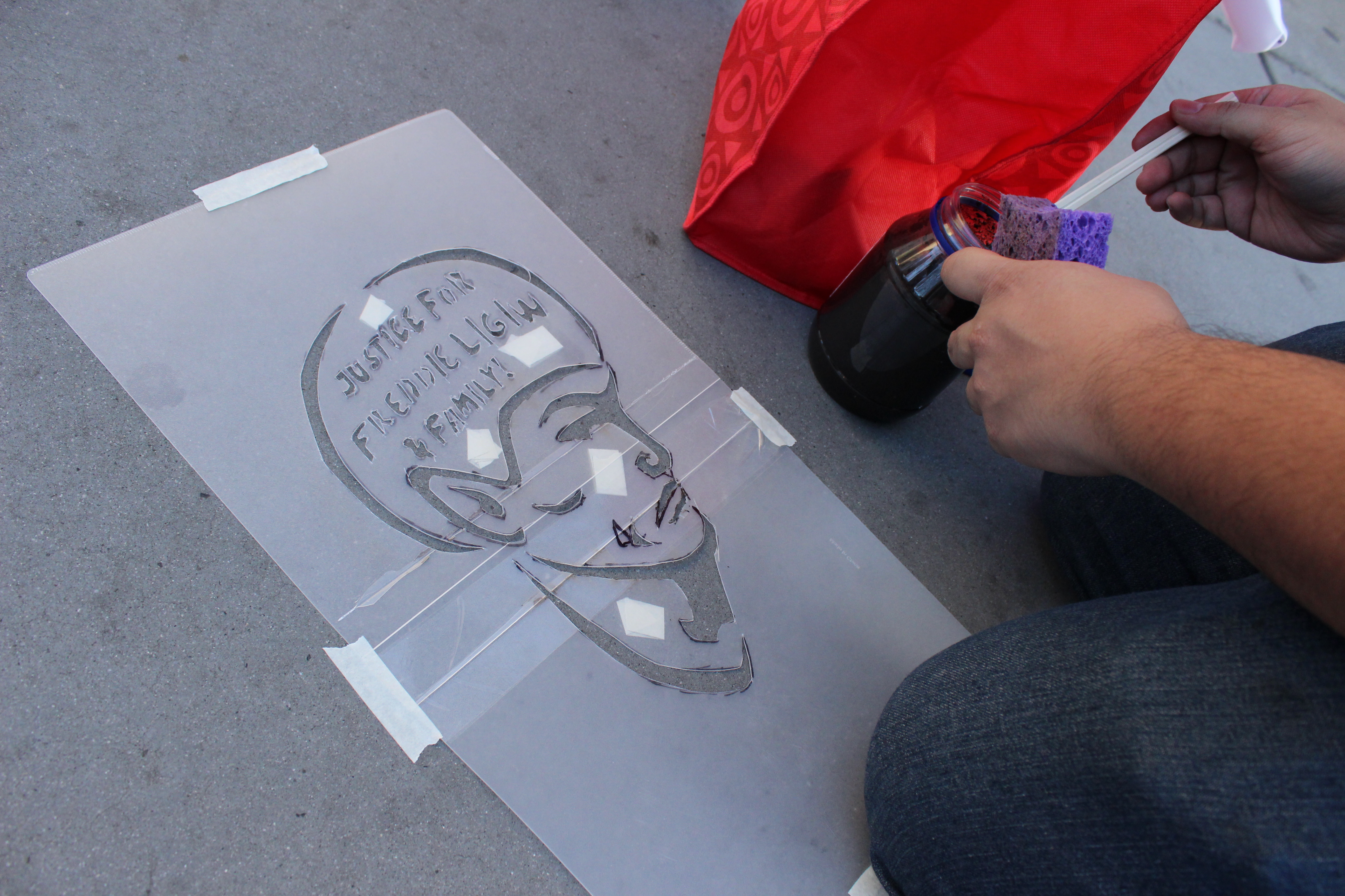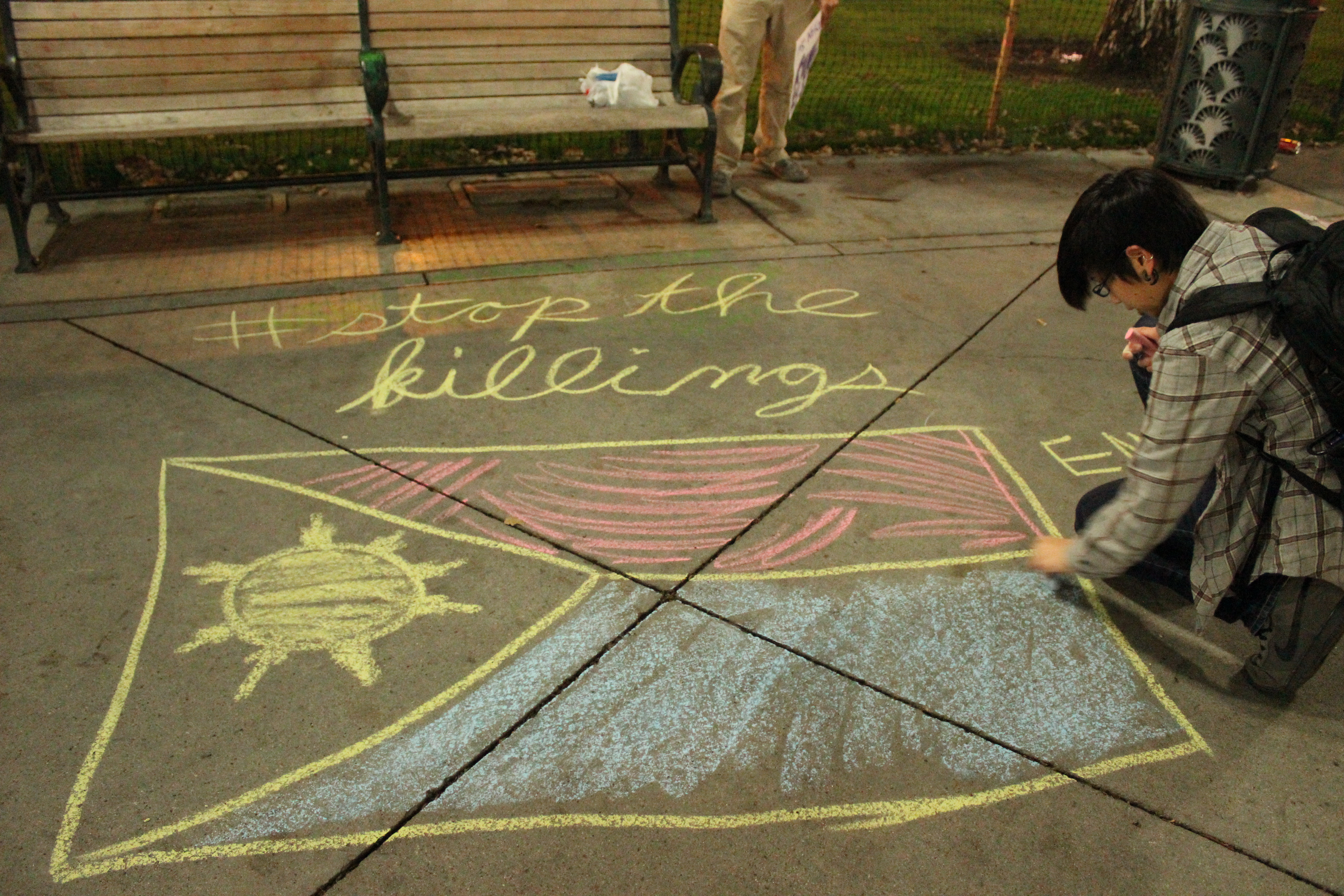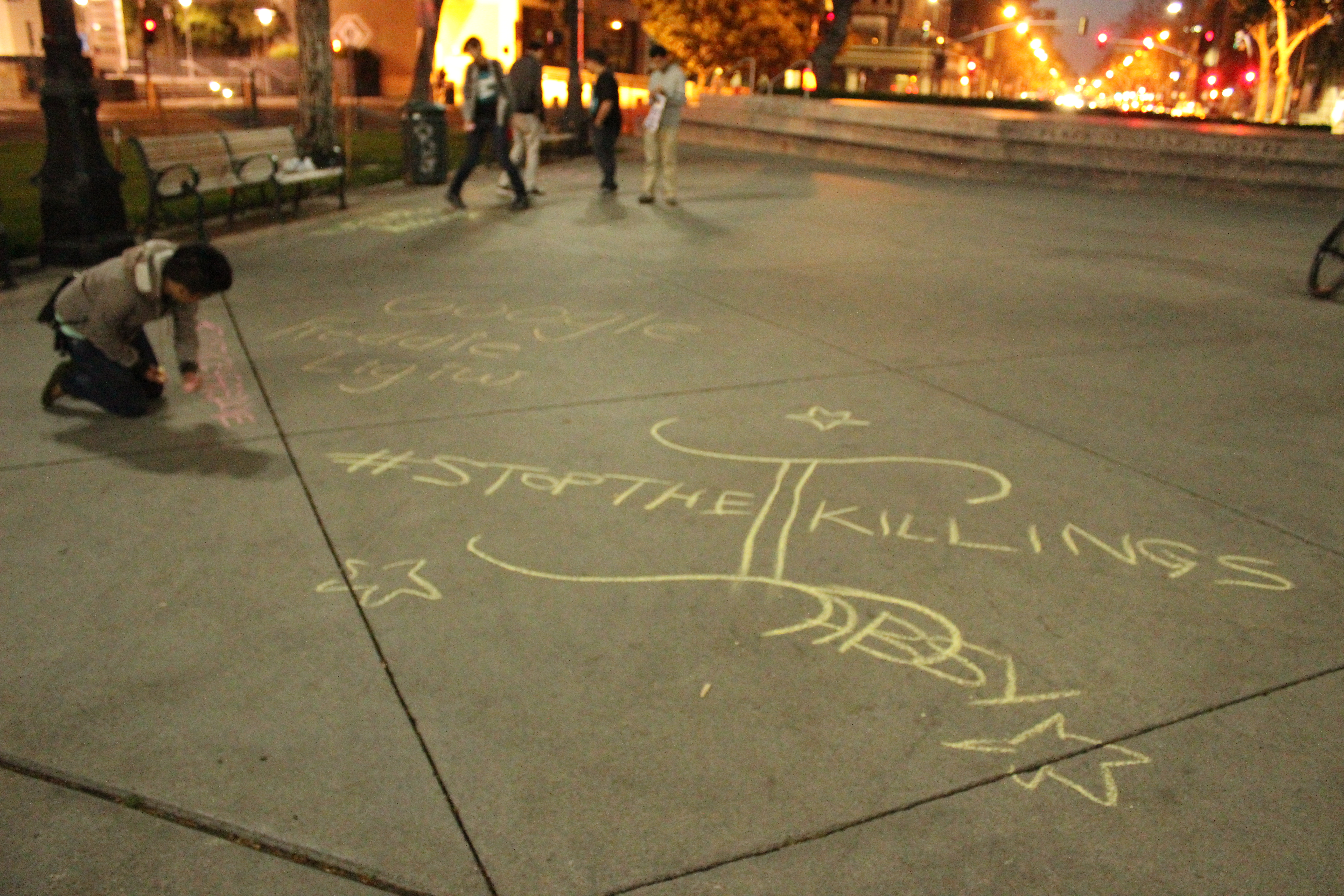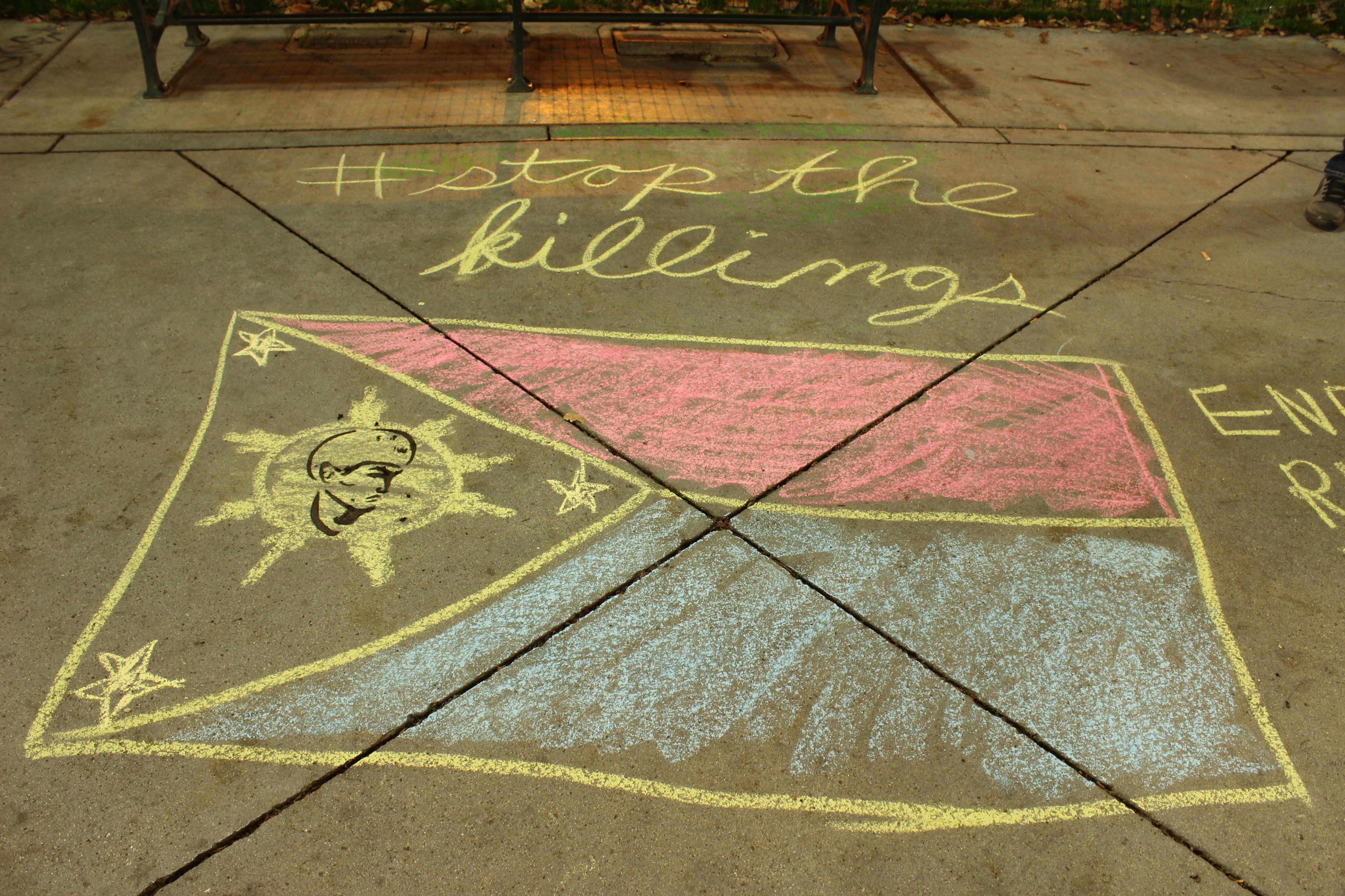 3/14/2014, San Jose, CA — Anakbayan Silicon Valley and PAWIS held a mobile “die-in” and mud stencil action demanding justice for Freddie Ligiw and his family. The action called for an end to state-sponsored violence in the Philippines. Members gathered starting at Martin Luther King Library on San Jose State University’s campus then marched to San Jose’s City Hall and ended the program at Cesar Chavez Memorial Park. ABSV’s statement was handed out to raise awareness in the local community. The program included members laying on the ground holding placards while their bodies are outlined with chalk to call attention to the ongoing extrajudicial killings occurring in the Philippines. At the end, members marched through downtown San Jose, chanting and concluding by reading a statement to demand Justice for Freddie Ligiw and his family, and to stop US aid to to the Philippine government. The pictures are shown below.