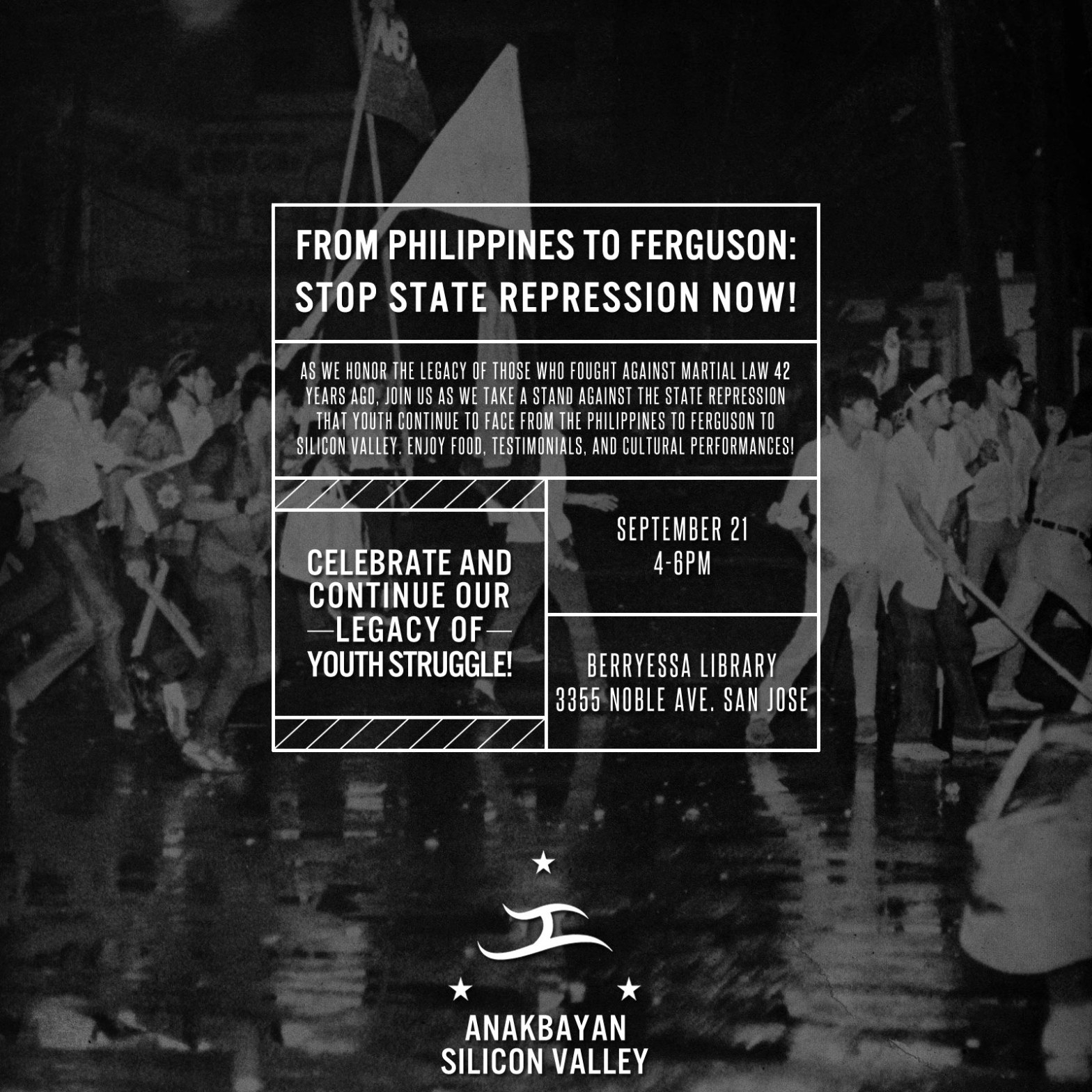 9/21 — 4-6PM @ Berryessa Library, San Jose, CA. Come kick it with us on Sunday, September 21 to honor the legacy of those who fought against martial law in the Philippines 42 years ago. From Philippines to Ferguson to Silicon Valley, we’ll discuss how we can take a stand against state repression! We’ll have food, sharing, and cultural performances too!