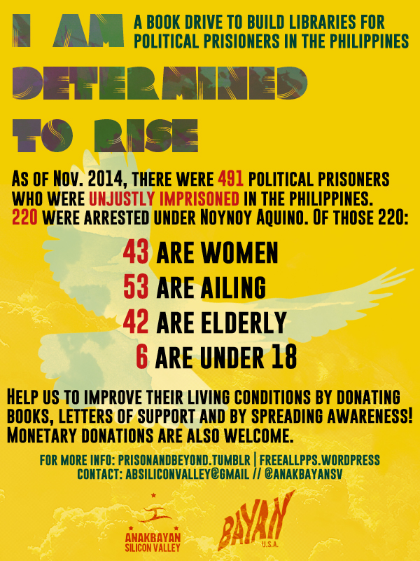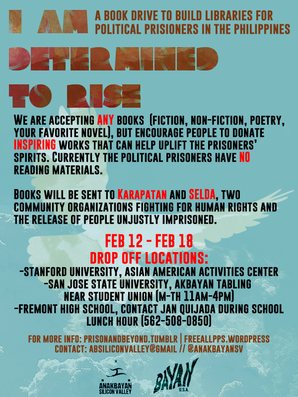 In commemoration of #PHSolidarityWeek, Anakbayan Silicon Valley (ABSV) stands with BAYAN-USA in raising awareness about the struggle of political prisoners in the Philippines. From February 12 to 18, ABSV will conduct a book donation drive to build libraries in the political prisoners’ cells and spread awareness of the conditions they face—a small gesture of our solidarity, as we concurrently fight for their freedom and the genuine liberation of our homeland. The prisoners currently have nothing to read, so anything will be much appreciated. Letters of support are also welcome from book donors.